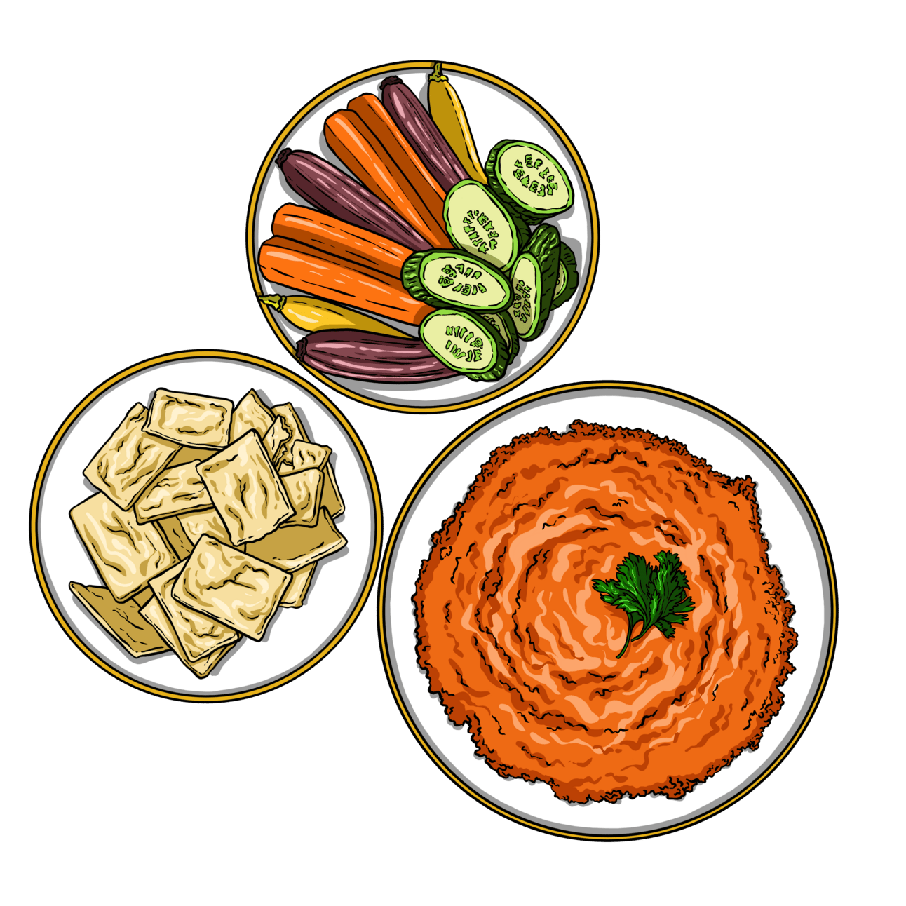 Blend all Muhammara Components until smooth. Adjust with more salt and flavor adjusters to preference. The texture should resemble hummus — thicken it up with more nuts/breadcrumbs, or thin it out with water.