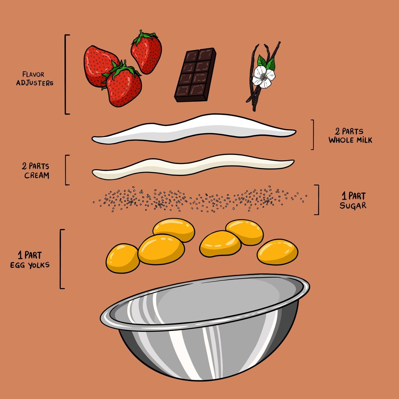 A starting point for a classic French custard base. Adjust the sweetness levels with the sugar, and the richness with the milk or cream fat content or proportions.