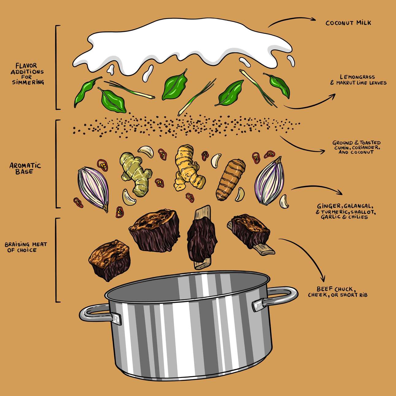 Good morning… Today’s main recipe framework is beef rendang, a flavorful Malaysian braise.