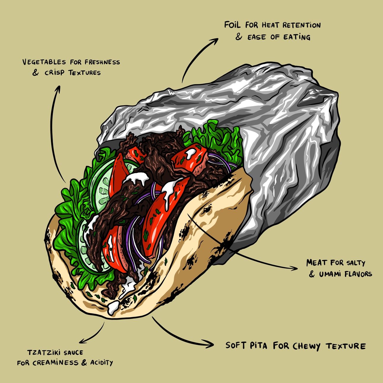 Wrap & serve: To a square of foil, add the pita and top with meat, vegetables, and sauce. Wrap up, let steam for a few minutes, then enjoy.